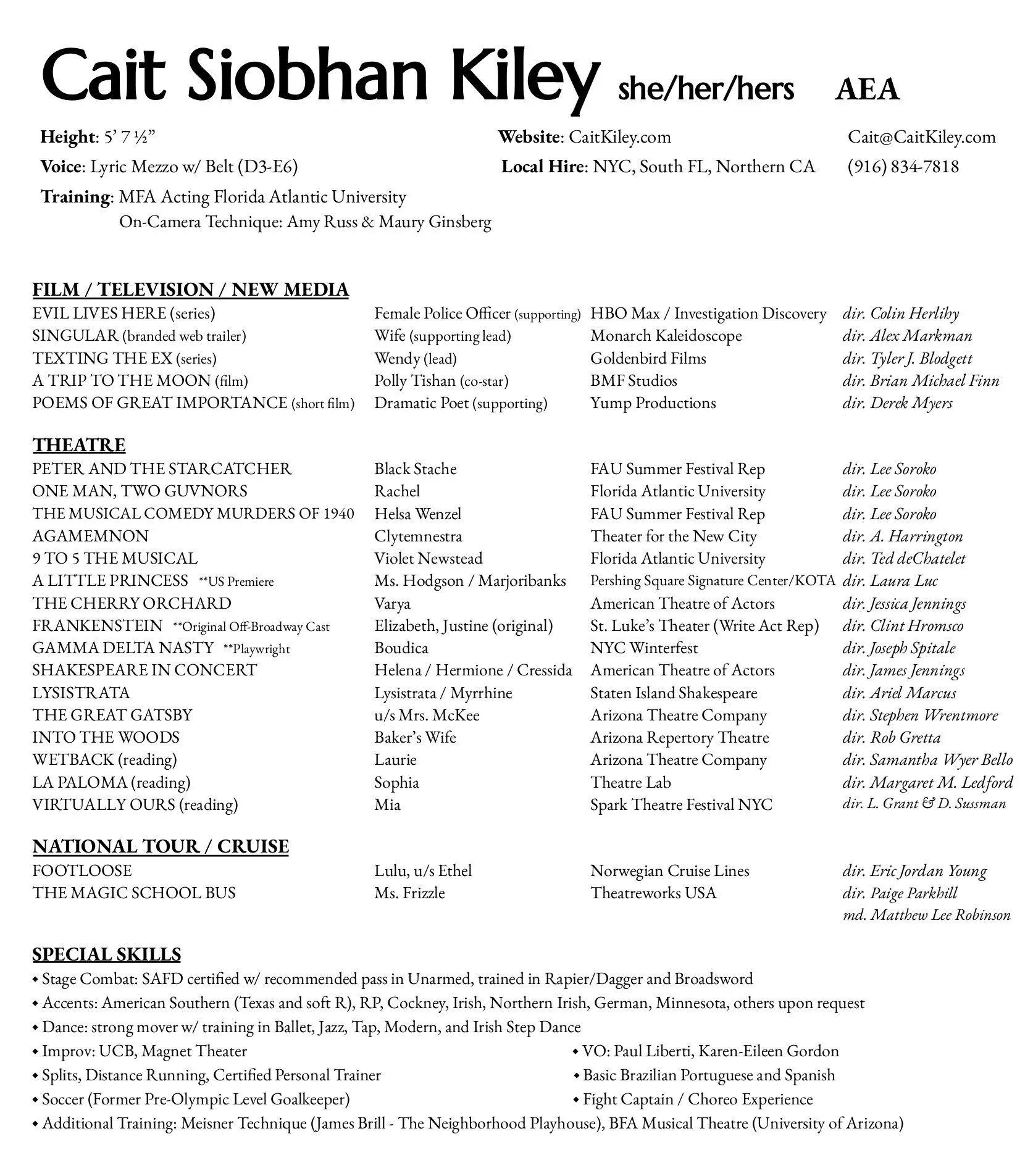 I recently earned my MFA in Acting from Florida Atlantic University, and have now returned to live in NYC full time (with local housing available to me in both South Florida and Northern California in addition to the NY Tri-State area).
